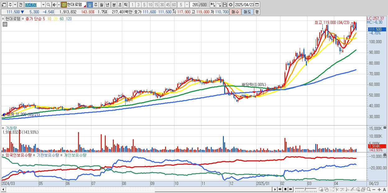 - 현대로템 (111,500원 ▼ -4.54% , 시총: 121,694억, 거래량: 1,366,494, 거래대금:1,552억)