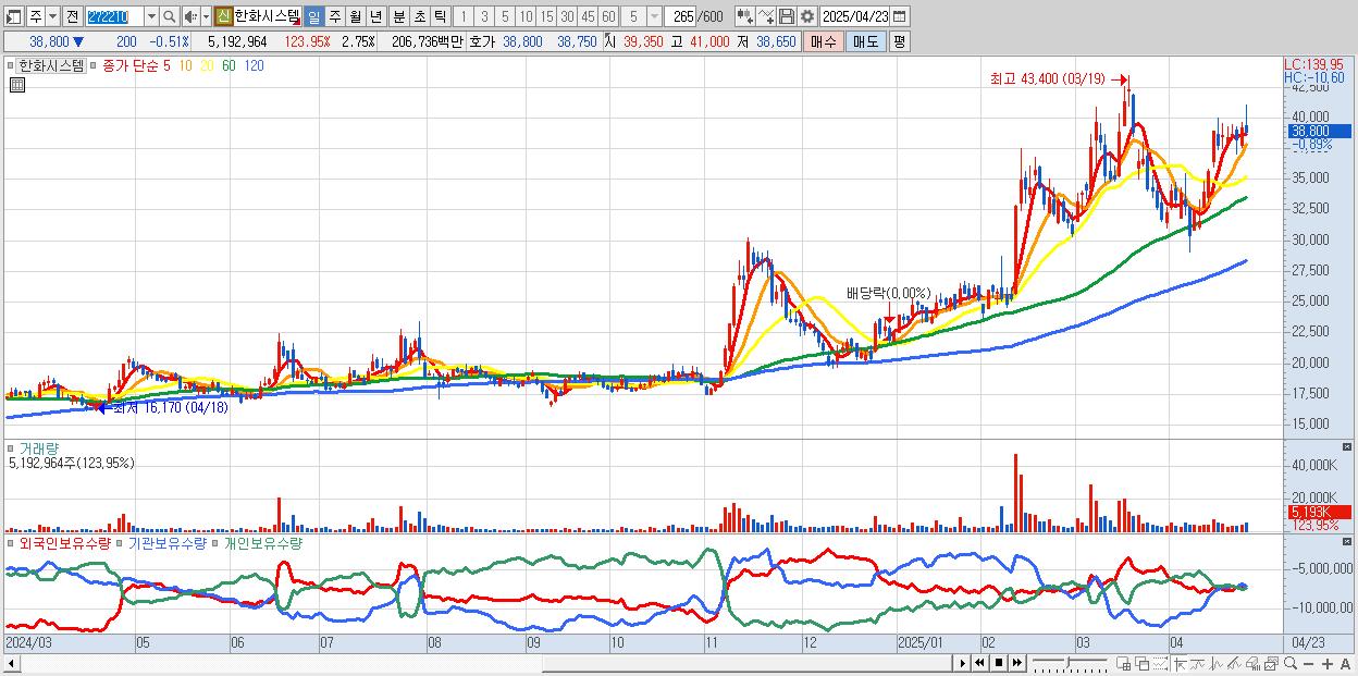 - 한화시스템 (38,800원 ▼ -0.51% , 시총: 73,301억, 거래량: 3,083,528, 거래대금:1,228억)
