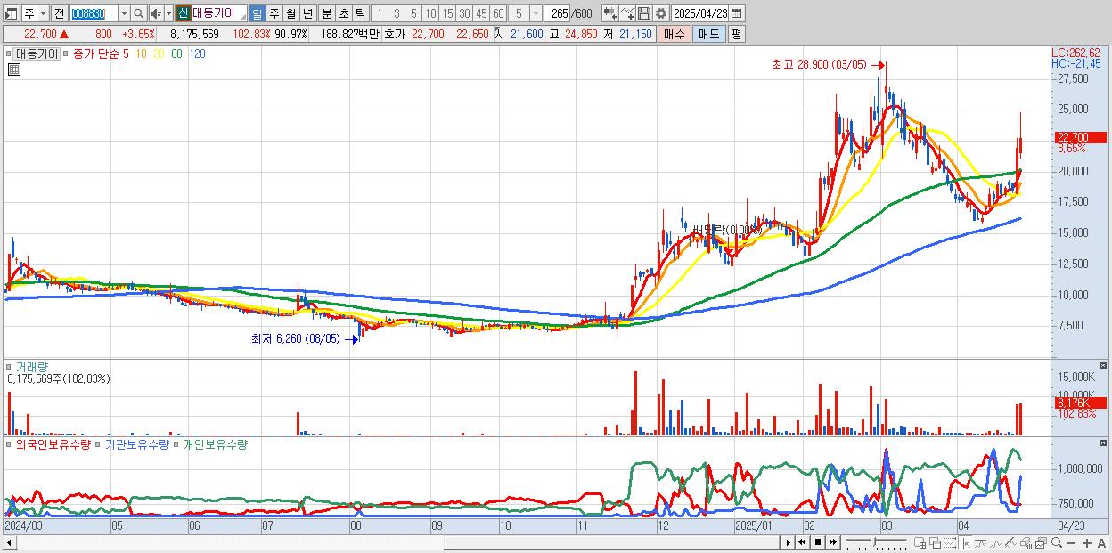 - 대동기어 (22,700원 ▲ 3.65% , 시총: 2,040억, 거래량: 8,175,569, 거래대금:1,888억)