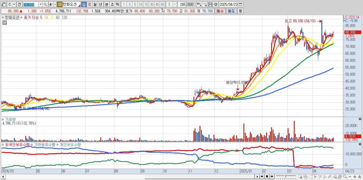 - 한화오션 (79,900원 ▲ 1.14% , 시총: 244,824억, 거래량: 2,700,319, 거래대금:2,170억)