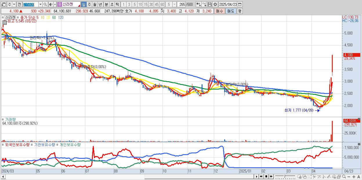 - 신라젠 (4,120원 ▲ 29.97% , 시총: 5,660억, 거래량: 28,138,472, 거래대금:1,090억)