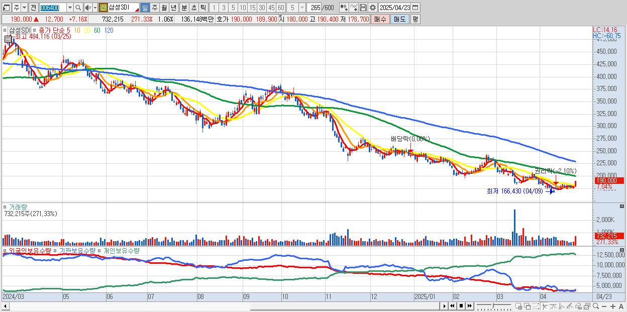 - 삼성SDI (190,400원 ▲ 7.39% , 시총: 130,928억, 거래량: 532,051, 거래대금:990억)
