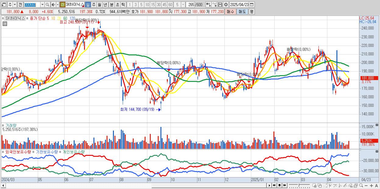 - SK하이닉스 (181,000원 ▲ 4.14% , 시총: 1,317,684억, 거래량: 3,857,373, 거래대금:6,942억)