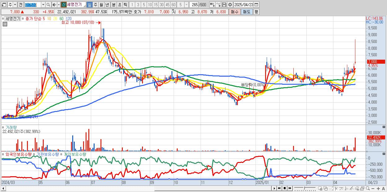 - 세명전기 (7,000원 ▲ 4.95% , 시총: 1,067억, 거래량: 22,492,021, 거래대금:1,760억)