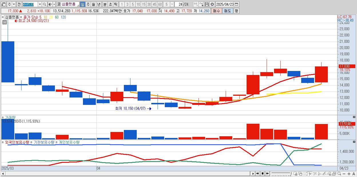 - 심플랫폼 (17,030원 ▲ 18.1% , 시총: 1,063억, 거래량: 13,514,283, 거래대금:2,220억)