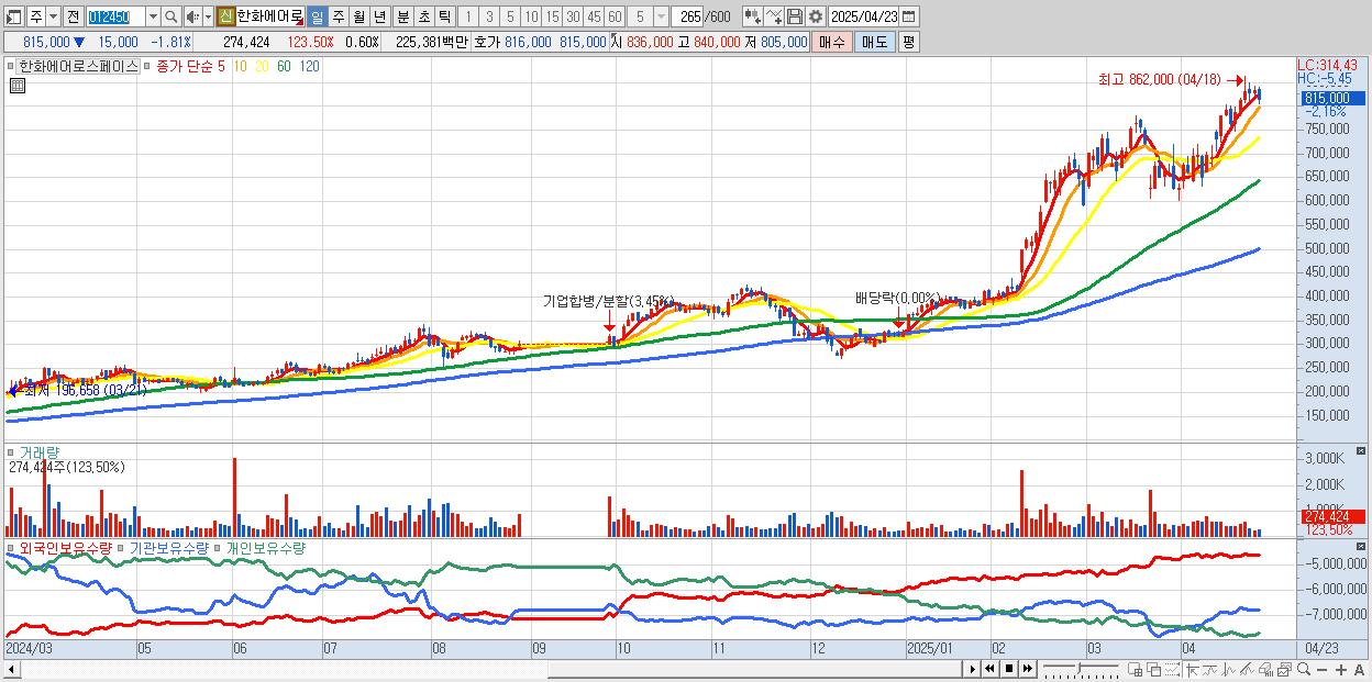 - 한화에어로스페이스 (814,000원 ▼ -1.93% , 시총: 371,031억, 거래량: 191,206, 거래대금:1,570억)