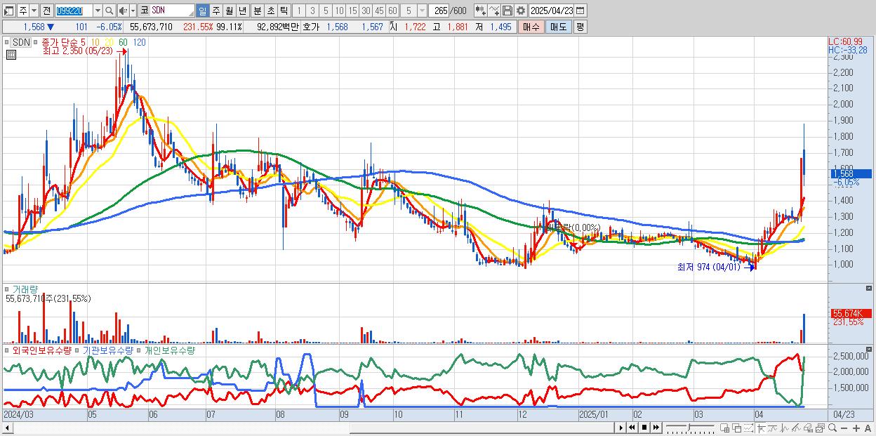 - SDN (1,568원 ▼ -6.05% , 시총: 881억, 거래량: 55,673,710, 거래대금:929억)
