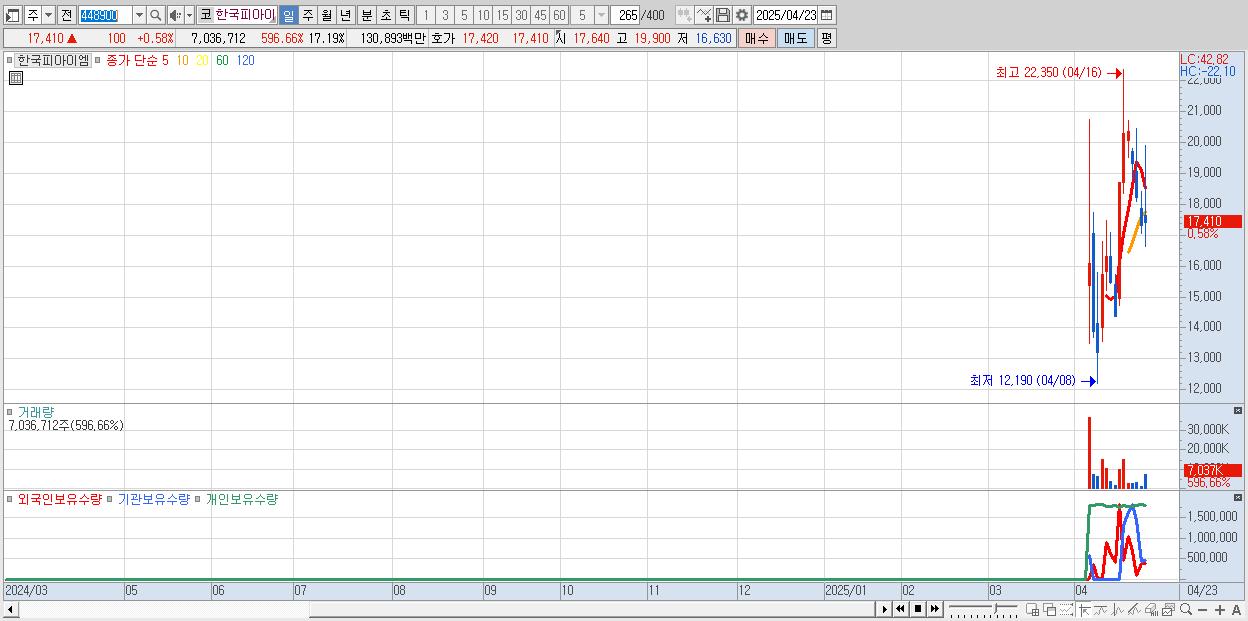 - 한국피아이엠 (17,410원 ▲ 0.58% , 시총: 1,045억, 거래량: 7,036,712, 거래대금:1,309억)