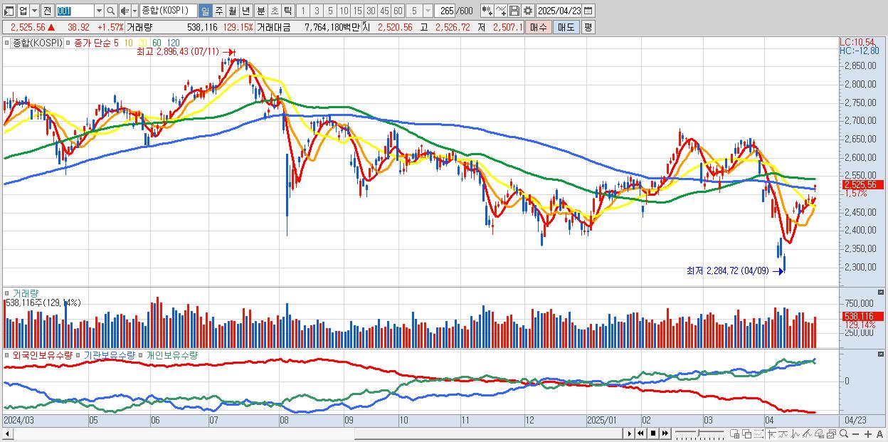 | 04/23 | 2,525.56 | ▲1.57% | -5,485억 | -1,977억 | 6,866억 | 596억 |