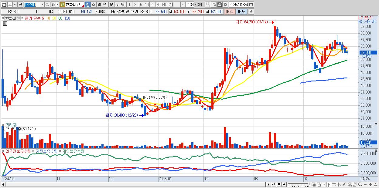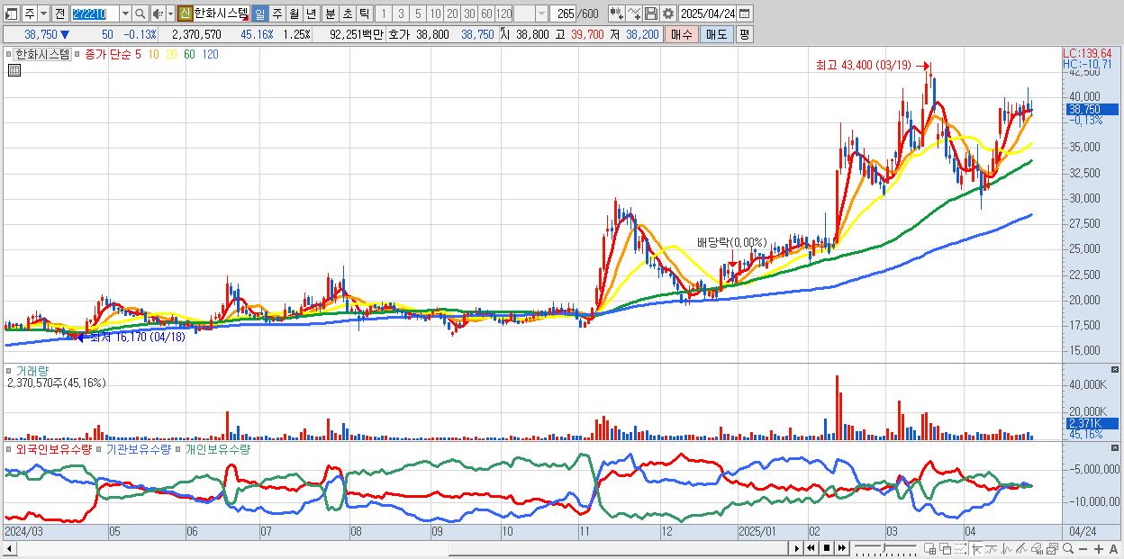 - 한화시스템 (38,800원 0% , 시총: 73,301억, 외국인 순매수 거래금:65억)