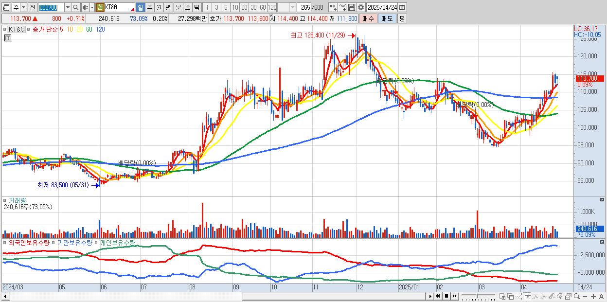 - KT&G (113,500원 ▲ 0.53% , 시총: 138,541억, 외국인 순매수 거래금:53억)