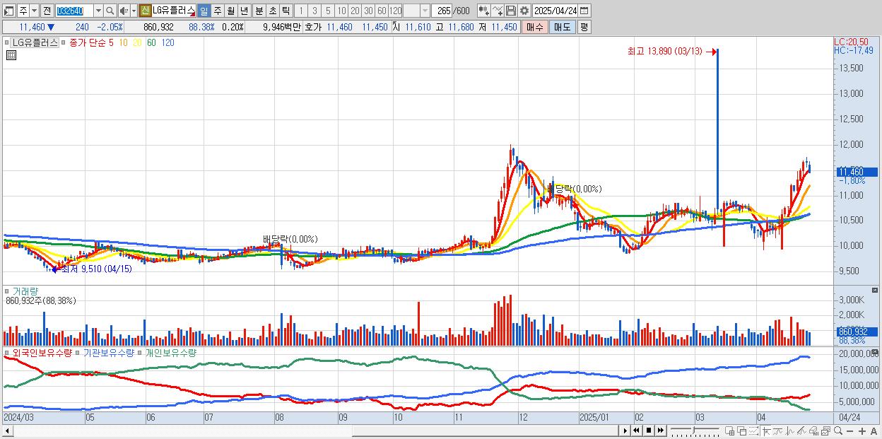 - LG유플러스 (11,540원 ▼ -1.37% , 시총: 50,385억, 외국인 순매수 거래금:42억)