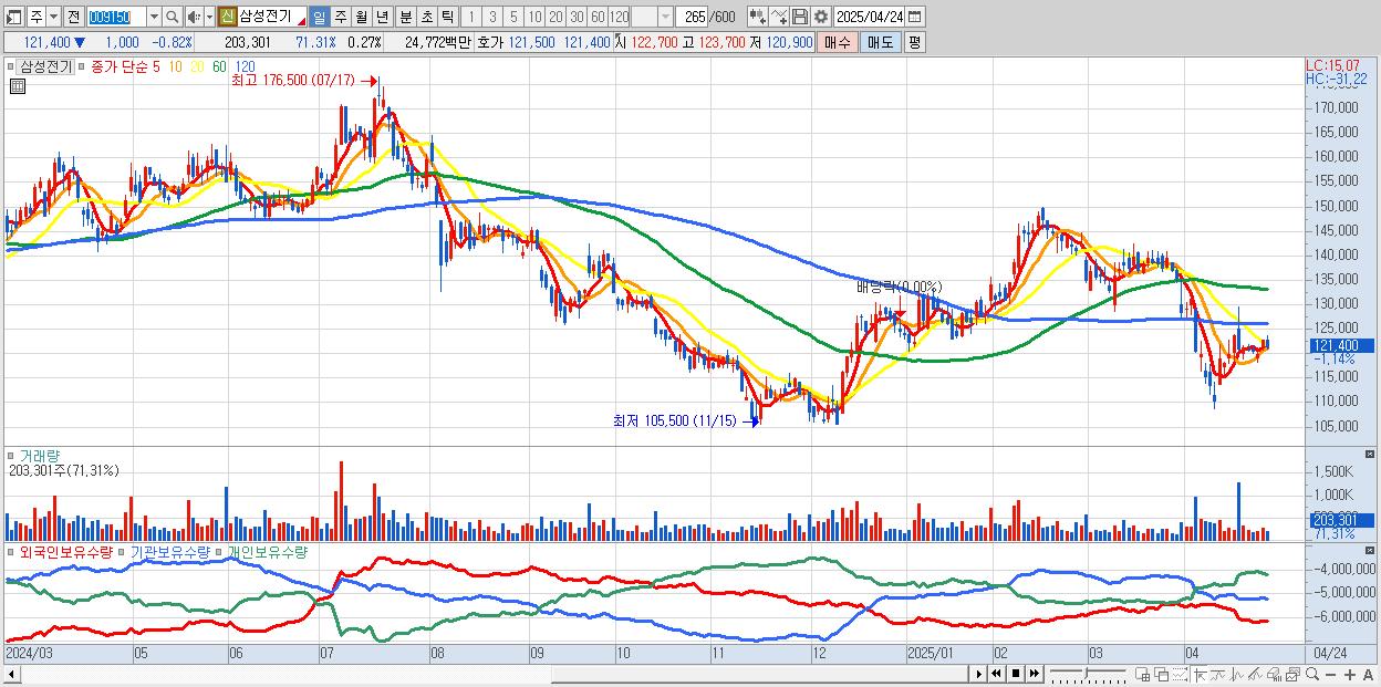- 삼성전기 (122,000원 ▼ -0.33% , 시총: 91,126억, 외국인 순매수 거래금:42억)