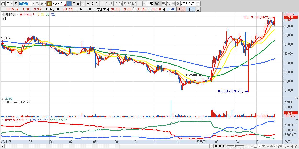 - 현대건설 (40,000원 ▲ 4.03% , 시총: 44,542억, 거래량: 1,011,208, 거래대금:401억, KOSPI)