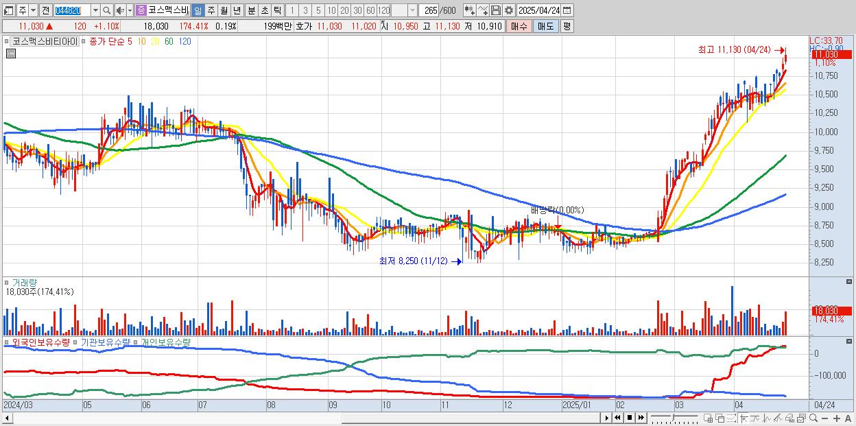 - 코스맥스비티아이 (11,030원 ▲ 1.1% , 시총: 1,059억, 거래량: 18,030, 거래대금:2억, KOSPI)