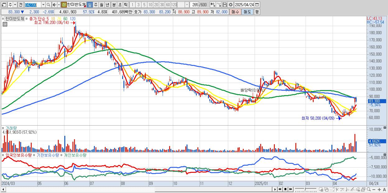 - 한미반도체 (83,300원 ▼ -2.69% , 시총: 80,480억, 거래량: 2,444,483, 거래대금:2,096억)