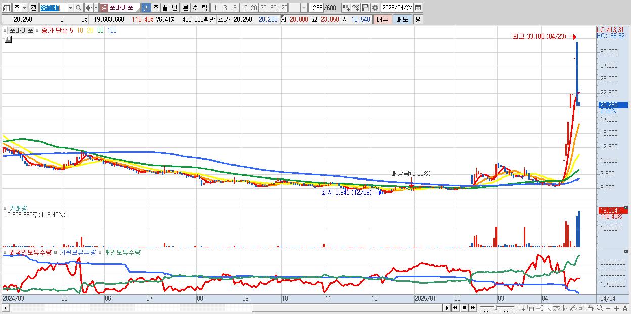 - 포바이포 (20,250원 0% , 시총: 2,250억, 거래량: 19,603,660, 거래대금:4,063억)
