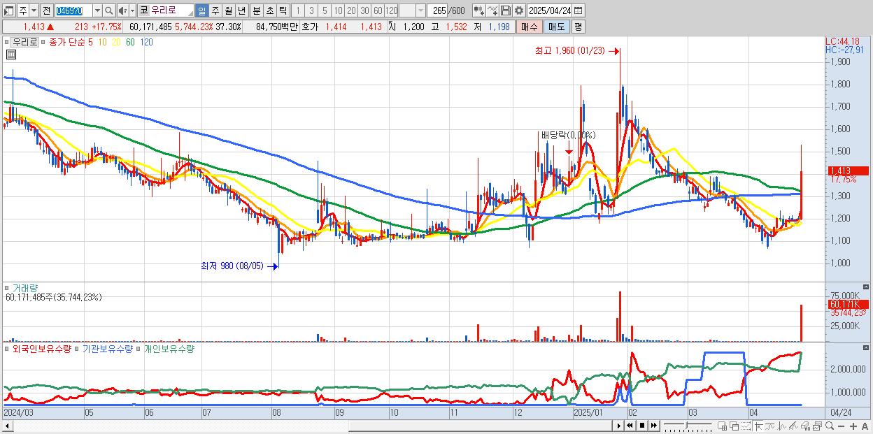 - 우리로 (1,413원 ▲ 17.75% , 시총: 619억, 거래량: 60,171,485, 거래대금:848억)