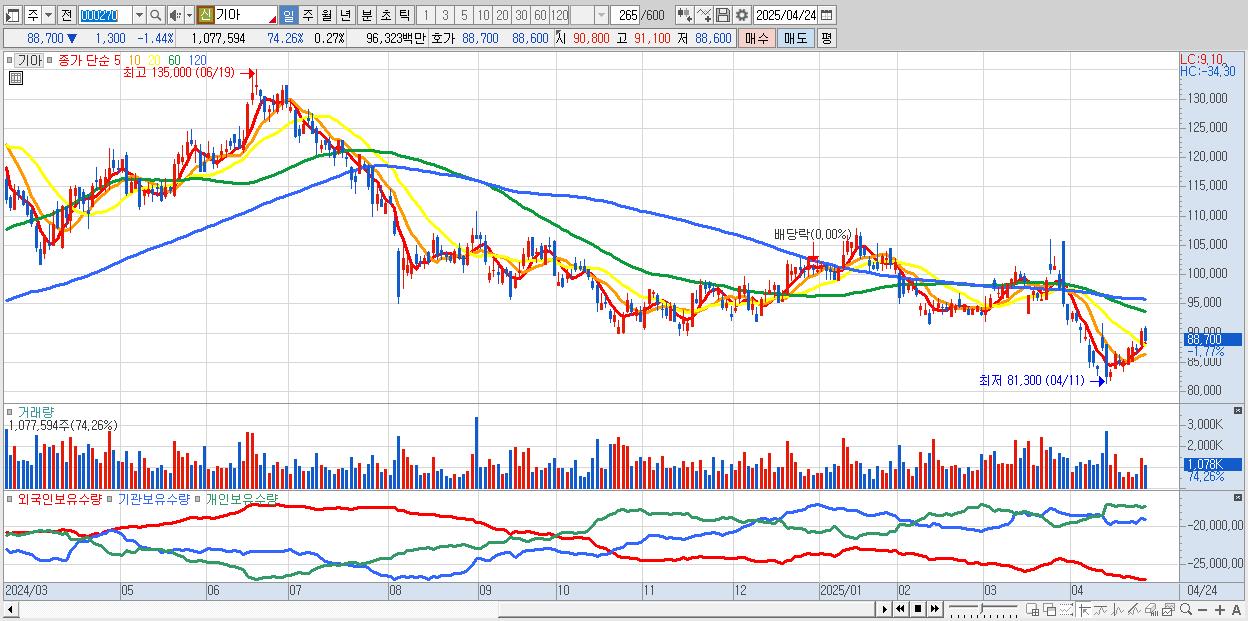 - 기아 (88,800원 ▼ -1.33% , 시총: 353,133억, 거래량: 908,535, 거래대금:812억)