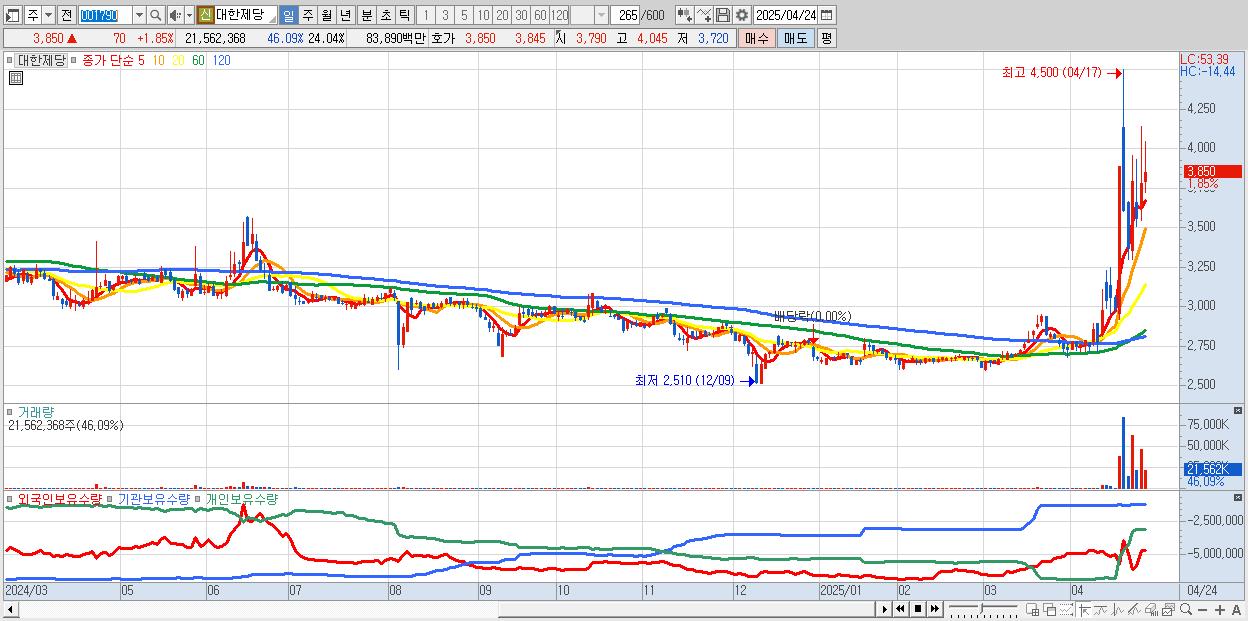 - 대한제당 (3,850원 ▲ 1.85% , 시총: 3,453억, 거래량: 21,562,368, 거래대금:839억)