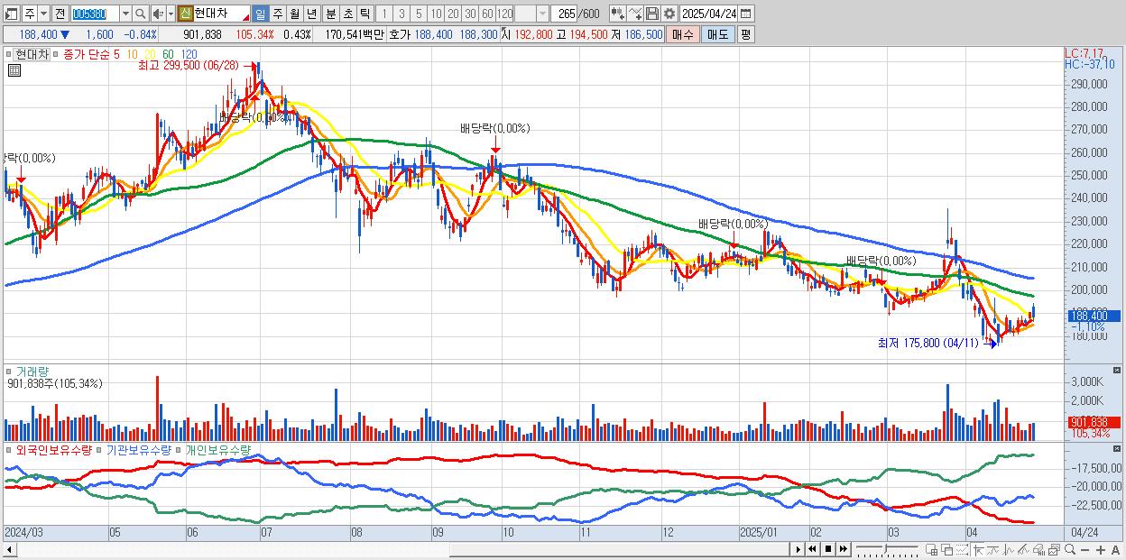 - 현대차 (188,900원 ▼ -0.58% , 시총: 395,587억, 거래량: 642,753, 거래대금:1,215억)