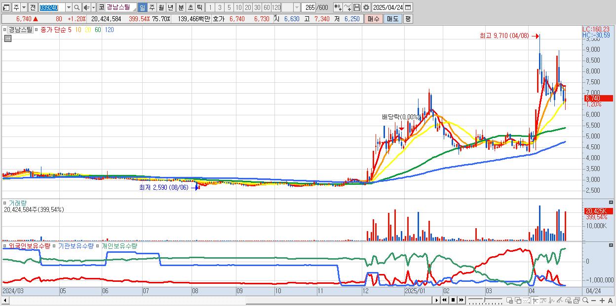 - 경남스틸 (6,740원 ▲ 1.2% , 시총: 1,818억, 거래량: 20,424,584, 거래대금:1,395억)