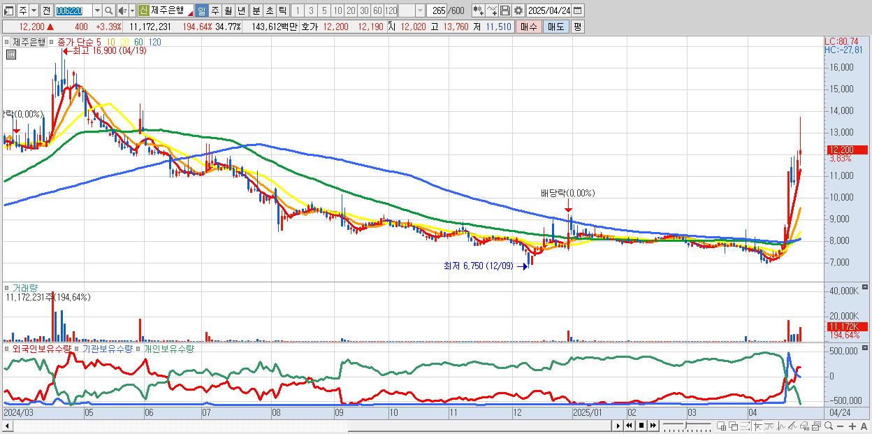 - 제주은행 (12,290원 ▲ 4.15% , 시총: 3,949억, 거래량: 7,551,862, 거래대금:972억)