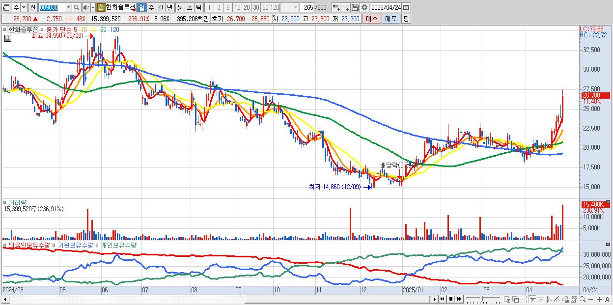 - 한화솔루션 (27,100원 ▲ 13.15% , 시총: 46,583억, 거래량: 9,100,548, 거래대금:2,330억)
