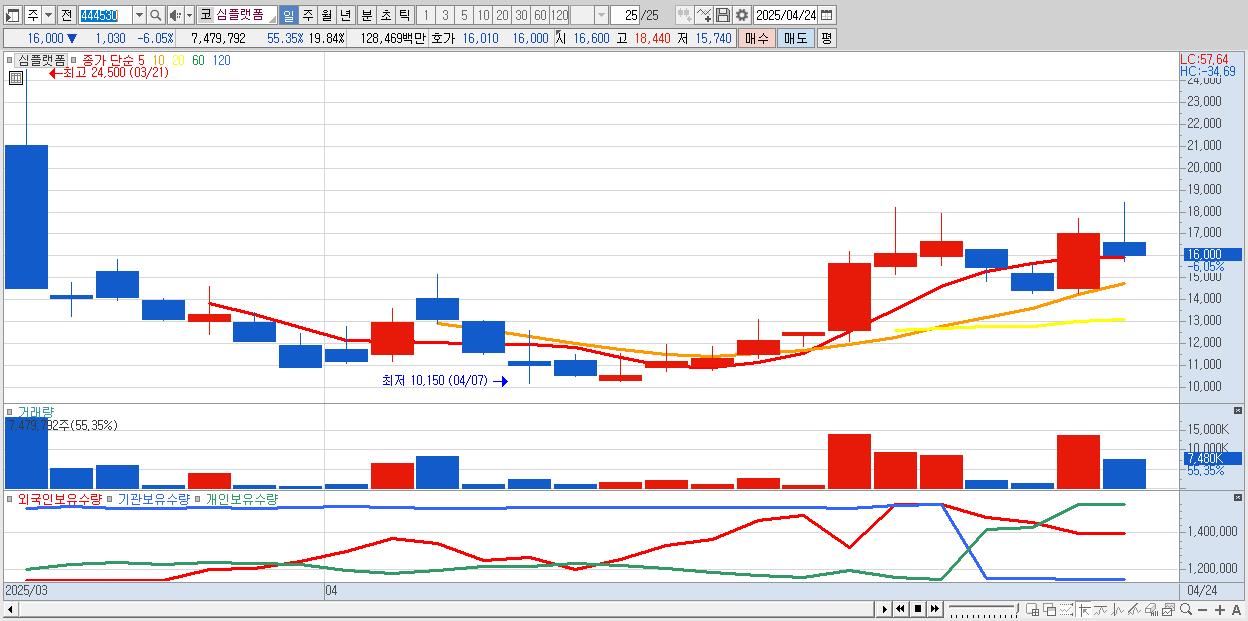 - 심플랫폼 (16,000원 ▼ -6.05% , 시총: 999억, 거래량: 7,479,792, 거래대금:1,285억)
