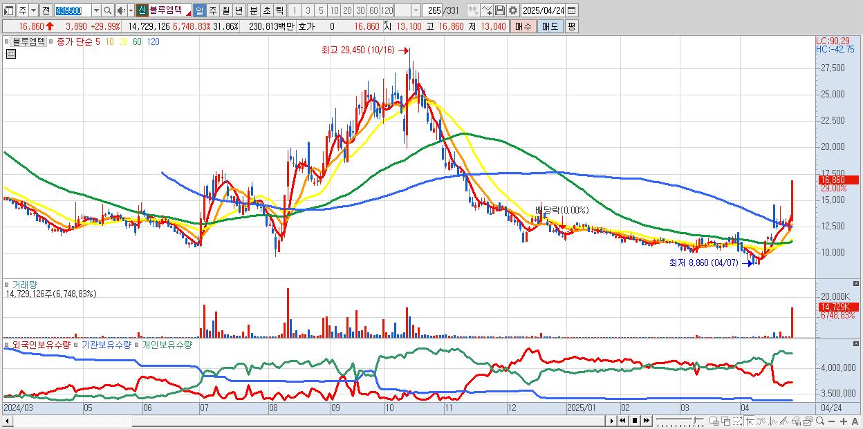 - 블루엠텍 (16,860원 ▲ 29.99% , 시총: 1,883억, 거래량: 9,432,266, 거래대금:1,478억)