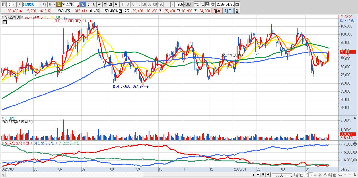 - SK스퀘어 (89,700원 ▲ 7.17% , 시총: 119,793억, 외국인 순매수 거래금:58억)