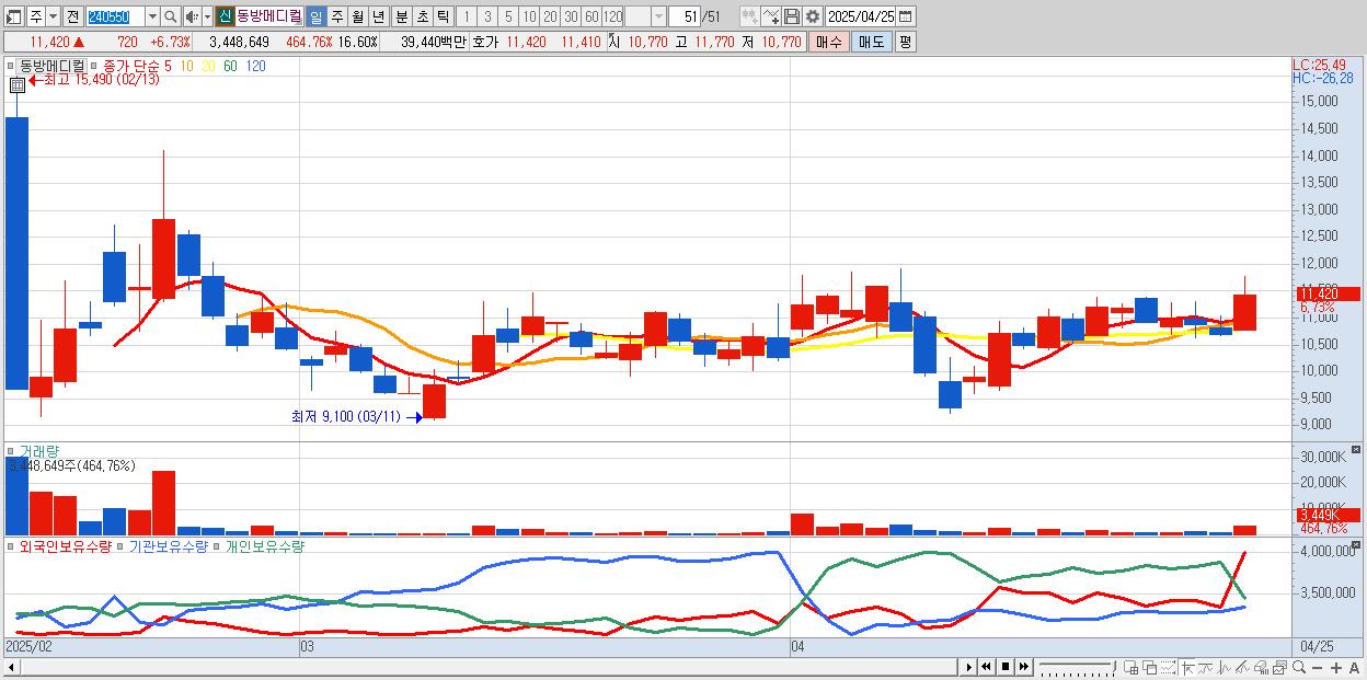 - 동방메디컬 (11,420원 ▲ 6.73% , 시총: 2,372억, 외국인 순매수 거래금:49억)