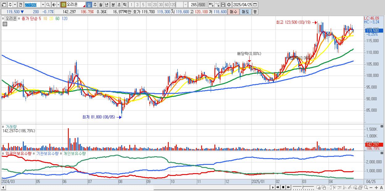 - 오리온 (119,600원 ▼ -0.08% , 시총: 47,285억, 외국인 순매수 거래금:73억)