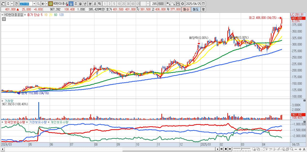 - HD한국조선해양 (265,500원 ▲ 6.41% , 시총: 187,903억, 외국인 순매수 거래금:384억)