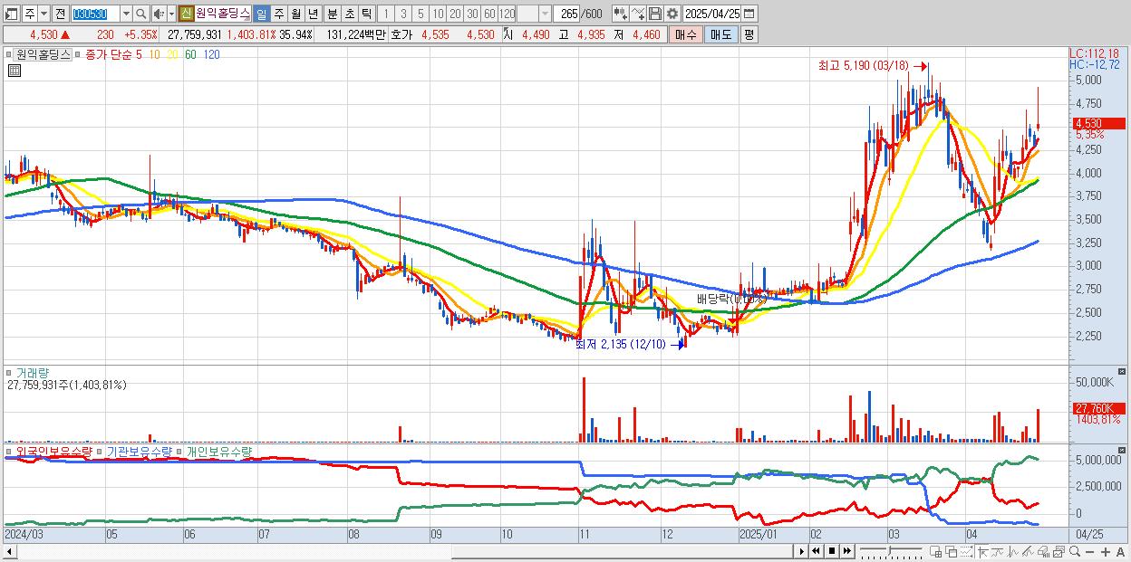 - 원익홀딩스 (4,530원 ▲ 5.35% , 시총: 3,499억, 거래량: 27,759,931, 거래대금:1,312억)
