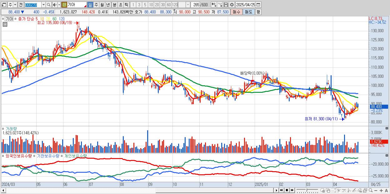- 기아 (88,200원 ▼ -0.68% , 시총: 350,747억, 거래량: 1,356,631, 거래대금:1,202억)