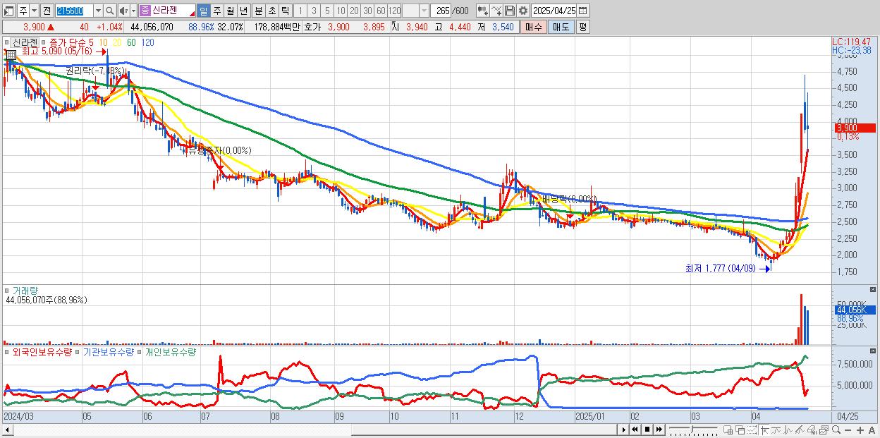 - 신라젠 (3,850원 ▼ -0.26% , 시총: 5,289억, 거래량: 23,747,509, 거래대금:966억)