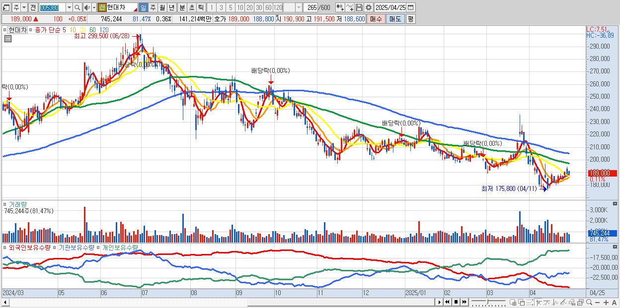 - 현대차 (188,800원 ▼ -0.05% , 시총: 395,378억, 거래량: 528,739, 거래대금:1,001억)