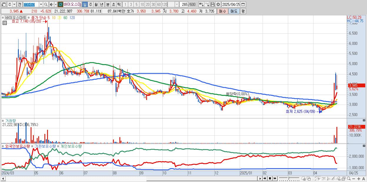 - 바이오스마트 (3,945원 ▲ 5.62% , 시총: 1,032억, 거래량: 21,222,987, 거래대금:878억)