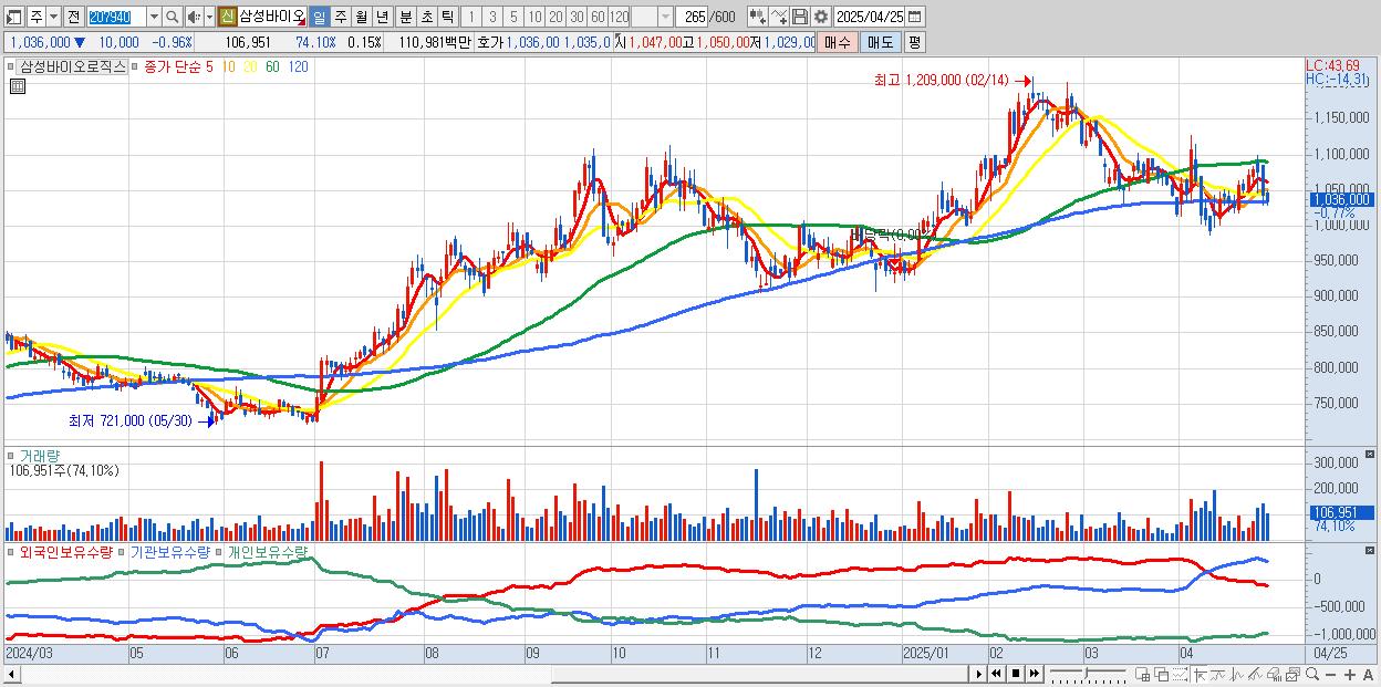 - 삼성바이오로직스 (1,035,000원 ▼ -1.05% , 시총: 736,651억, 거래량: 93,581, 거래대금:971억)