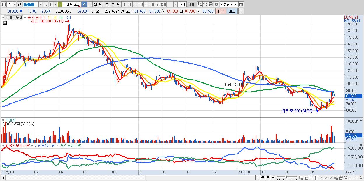 - 한미반도체 (82,500원 ▼ -0.96% , 시총: 79,707억, 거래량: 1,602,496, 거래대금:1,331억)