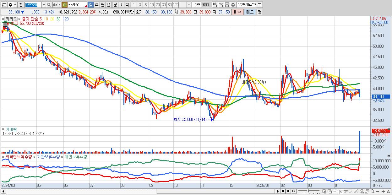 - 카카오 (37,950원 ▼ -3.8% , 시총: 168,450억, 거래량: 16,562,277, 거래대금:6,120억)