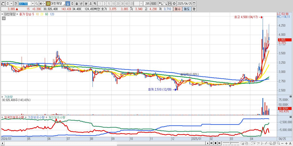 - 대한제당 (3,865원 ▲ 0.39% , 시총: 3,467억, 거래량: 30,926,408, 거래대금:1,245억)