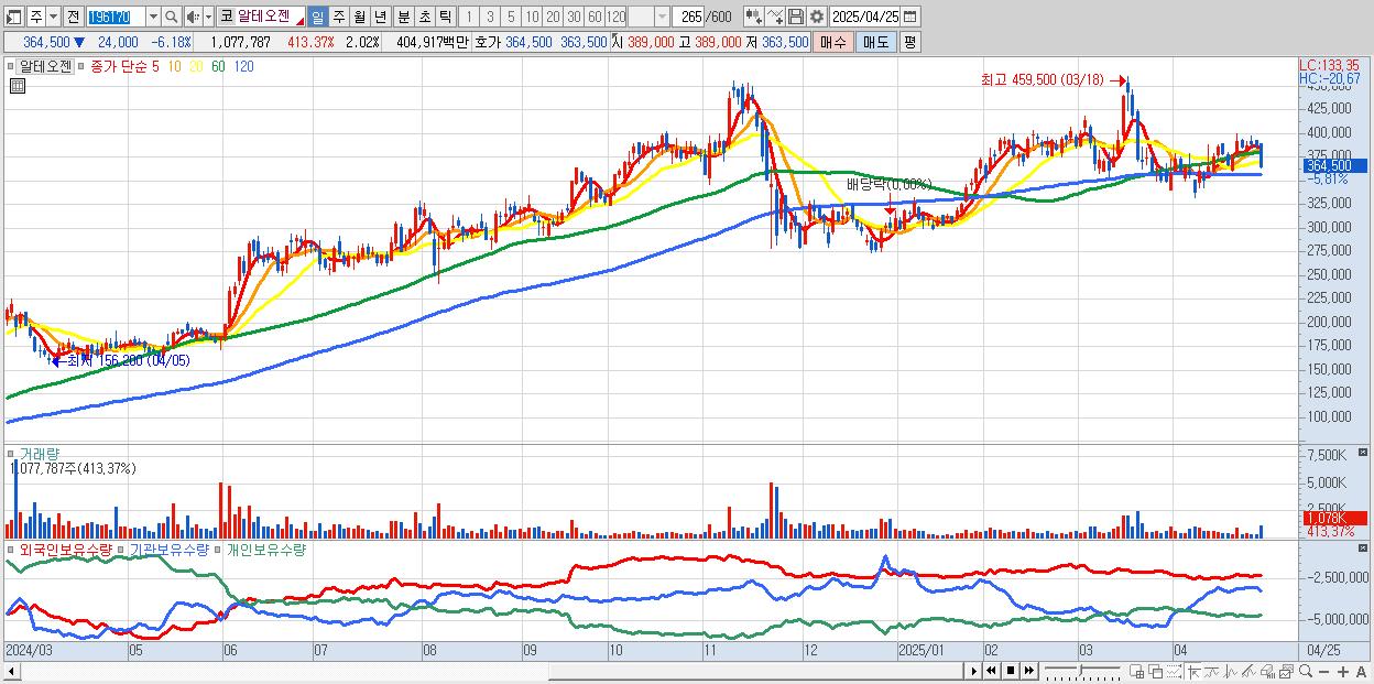 - 알테오젠 (369,000원 ▼ -5.02% , 시총: 196,746억, 거래량: 516,820, 거래대금:1,943억)