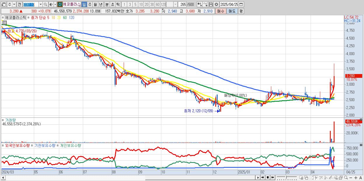 - 에코플라스틱 (3,280원 ▲ 10.07% , 시총: 1,350억, 거래량: 46,558,579, 거래대금:1,578억)