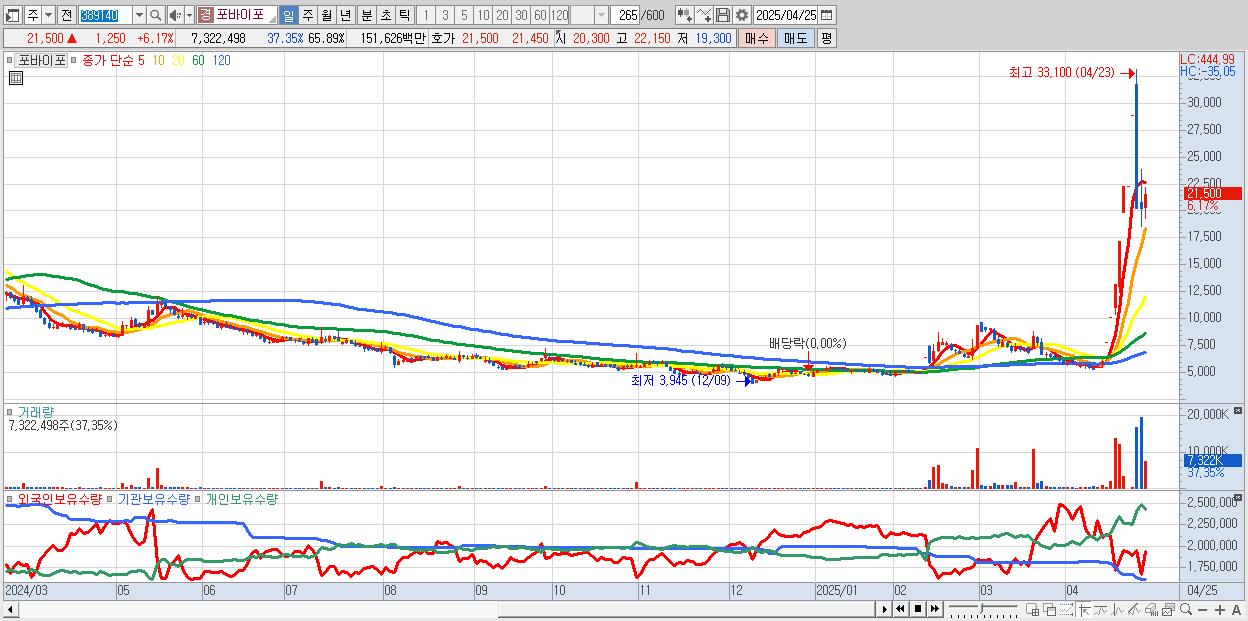 - 포바이포 (21,500원 ▲ 6.17% , 시총: 2,389억, 거래량: 7,322,498, 거래대금:1,516억)