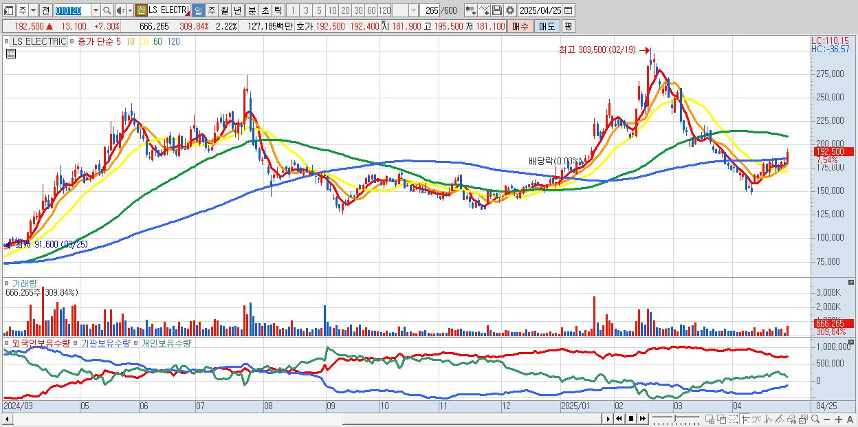 - LS ELECTRIC (192,300원 ▲ 7.19% , 시총: 57,690억, 거래량: 456,154, 거래대금:871억)