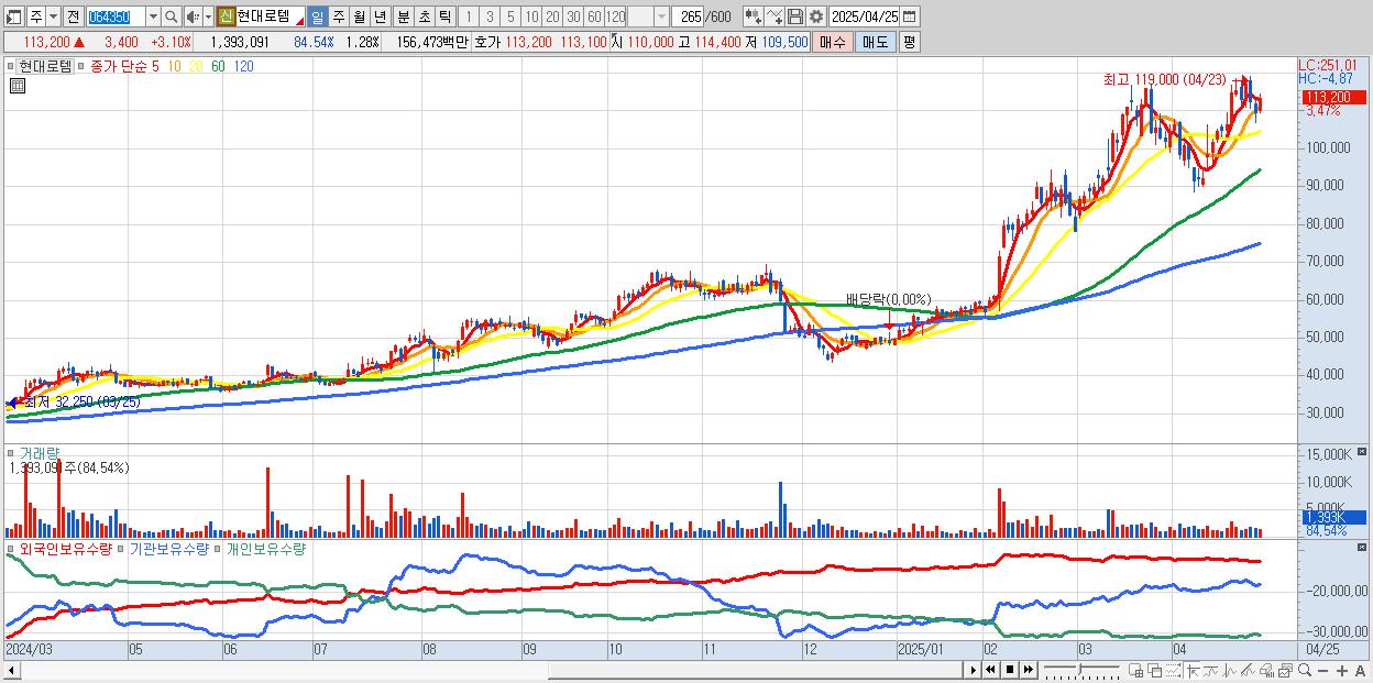 - 현대로템 (113,700원 ▲ 3.55% , 시총: 124,095억, 거래량: 981,508, 거래대금:1,103억)