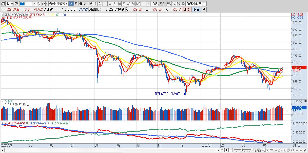 | 04/25 | 729.69 | ▲0.50% | -56억 | 785억 | -641억 | -87억 |