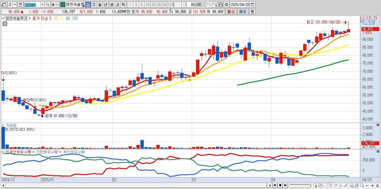 - 엠앤씨솔루션 (97,800원 ▲ 3.16% , 시총: 8,953억, 거래량: 106,643, 거래대금:106억, KOSPI)